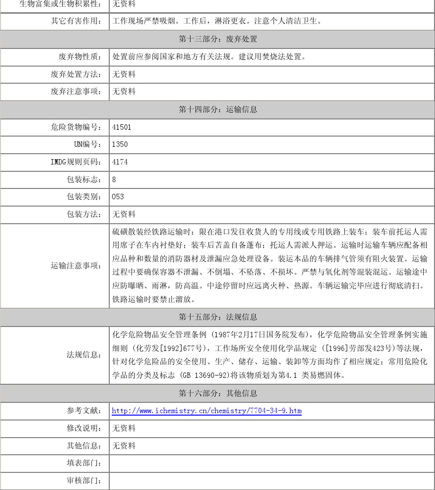 物化性質(zhì):性狀 粉狀硫黃為淡黃色粉末。熔點(diǎn)112.8℃沸點(diǎn)444.6℃相對密度2.07溶解性 易溶于二硫化碳,不溶于水,略溶于乙醇和醚類。